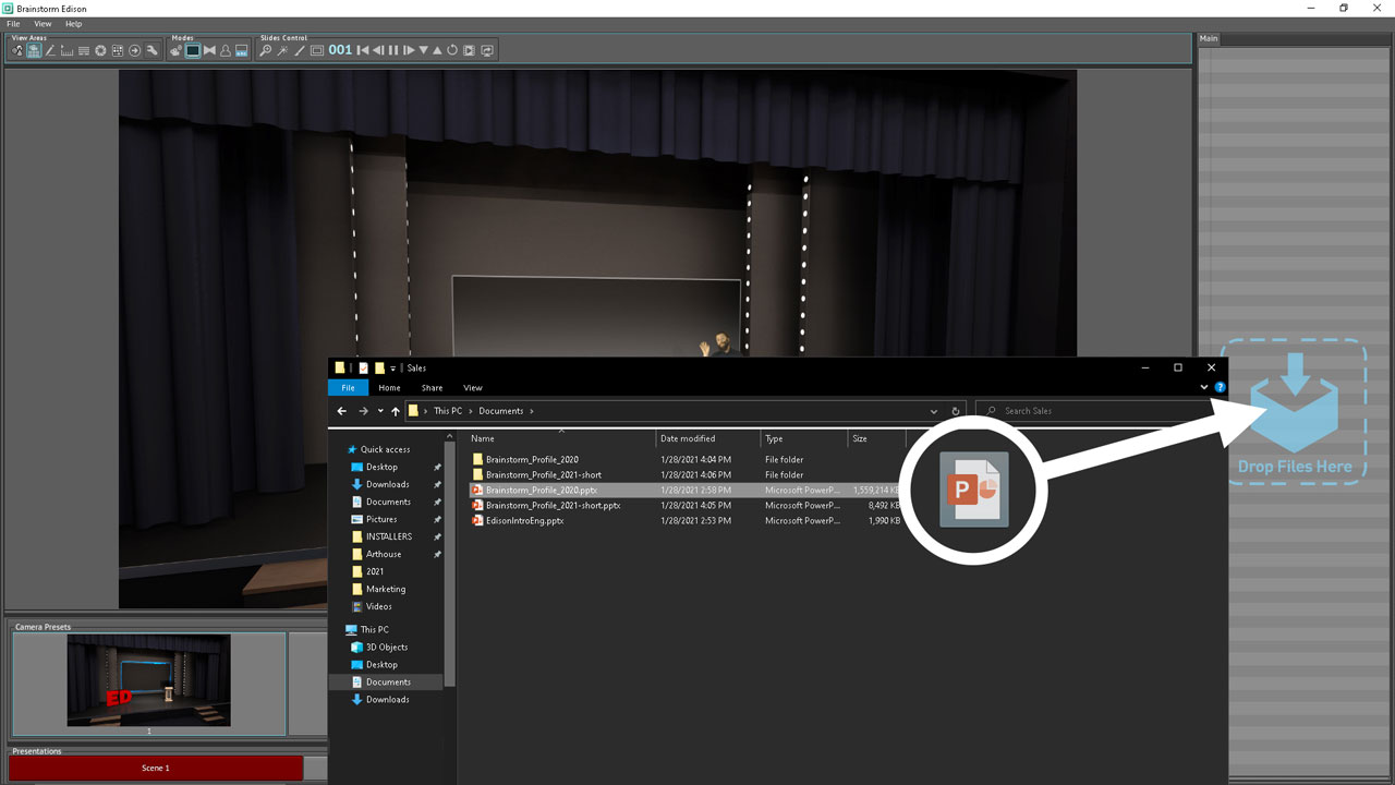 UE Visual 4KPro可以导入标准的PPT和PDF文件,主持人可以使用软件操作界面,来展示和控制幻灯片或页面。还可以使用点击器、智能手机或平板电脑来控制演示。软件自带虚拟屏幕并匹配幻灯片列表,可以通过拖拽加载各种内容,例如图片、视频、PPT、PDF、三维模型、互动模板、外来信号等。