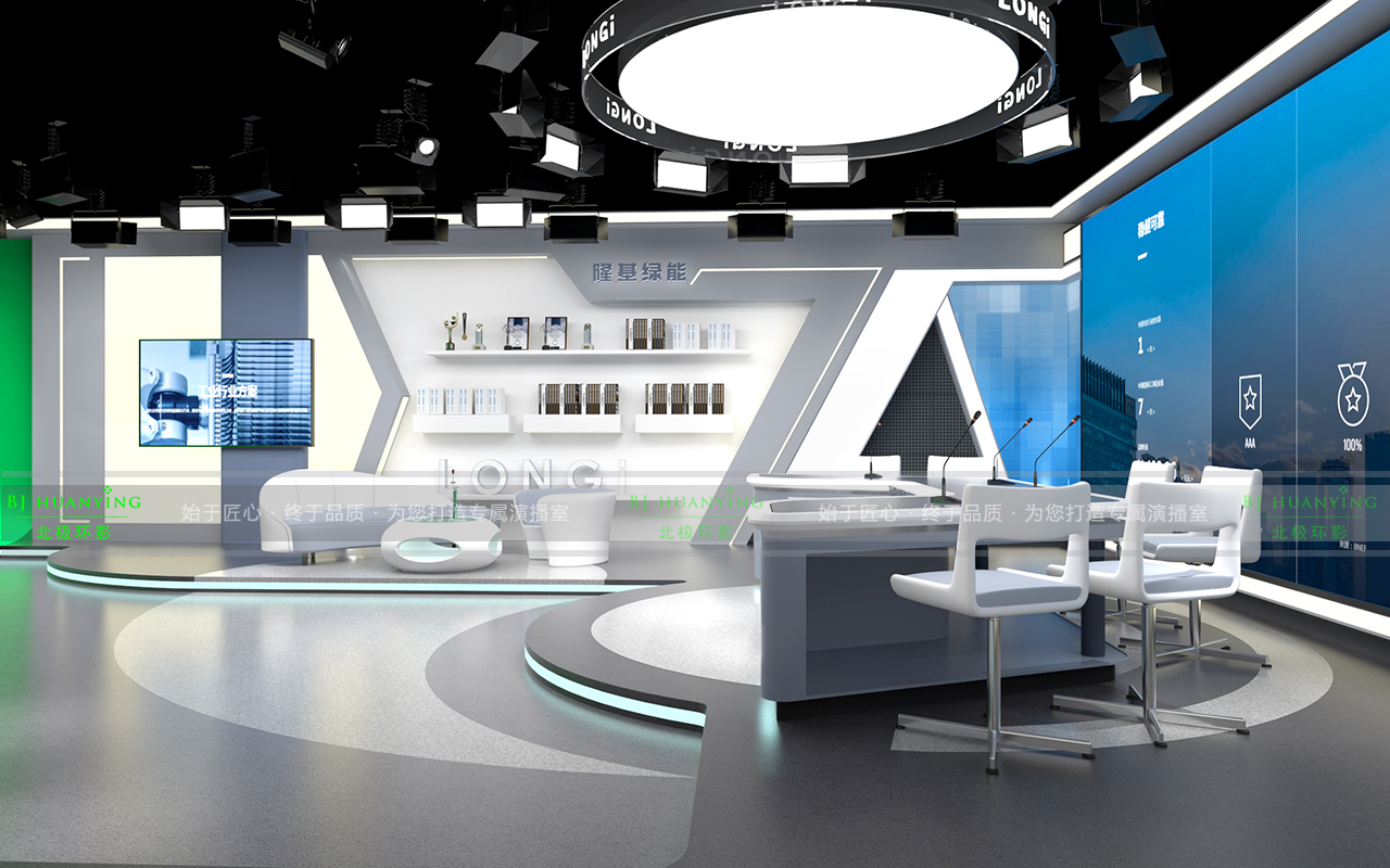 隆基股份全媒体演播室是集新闻制作、电视访谈、微课制作、虚拟拍摄等节目为一体的专业类综合演播室。在不失节目稳重的同时,又体现了演播环境的艺术品位,让节目与演播浑然一体是本建设的根本。本项目面积约110平米,施工周期70天。