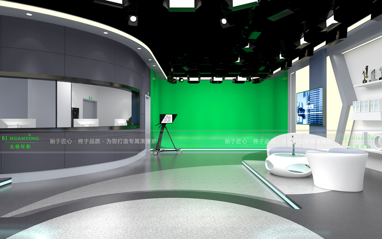虚拟抠像区可以展现产品及各类活动,根据节目的需求通过我司自主研发的4K虚拟演播室系统更换不同的背景。