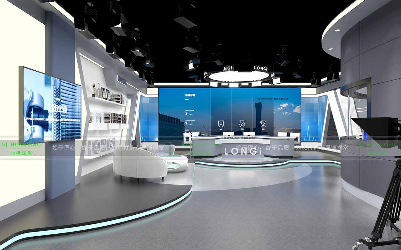 隆基股份全媒体演播室是集新闻制作、电视访谈、微课制作、虚拟拍摄等节目为一体的专业类综合演播室。在不失节目稳重的同时,又体现了演播环境的艺术品位,让节目与演播浑然一体是本建设的根本。本项目面积约110平米,施工周期70天。